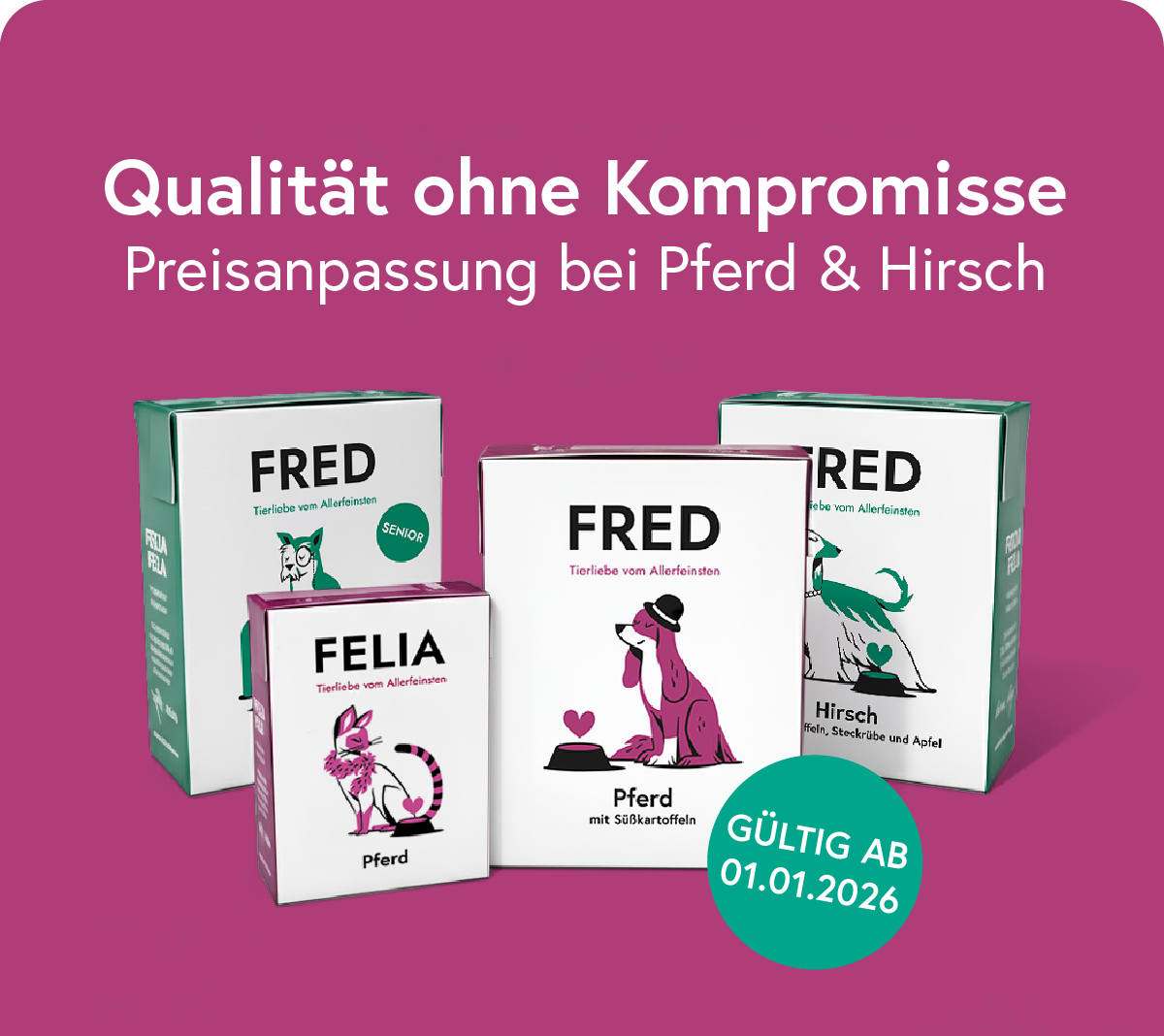 Qualität steht bei FRED & FELIA immer an erster Stelle! Damit wir auch weiterhin Fleisch in Premiumqualität beziehen können, müssen wir zum 01.01.2026 die Preise für einige Sorten mit Pferd und Wild anpassen. Hintergründe der Preisanpassung: